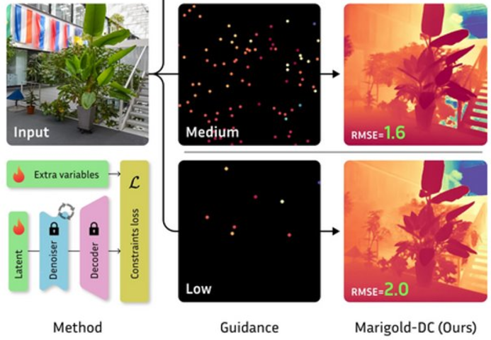 Training-free framework for zero-shot depth completion. We use Marigold as an off-the-shelf monocular depth estimator and guide its diffusion process with sparse depth observations.